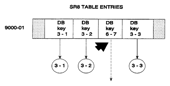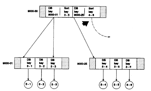 In a set sorted by db-key, the last db-key in an SR8 record should match the sort key in the upper level SR8 record just above. For example, in Figure 2.24, in the SR8 record on the right in the bottom level, the last db-key 3-6 does not match the sort key 4-8 in the SR8 record above it.