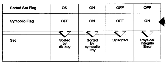 An SR8 record has flags that indicate whether the set is sorted and whether it is sorted by symbolic key. The sorted set flag ON and the symbolic key flag OFF indicates a set sorted by db-key. The sorted set flag ON and the symbolic key flag also ON indicates a set sorted by symbolic key. If the sorted set flag is OFF, the symbolic sort key flag should be OFF. Figure 2.26 shows the combinations of flag settings with their meanings.