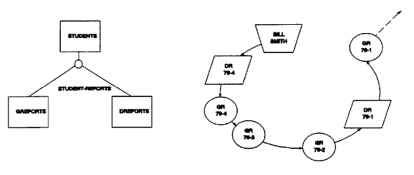 For example, in Figure 2.40, the STUDENT-REPORTS set contains two record types: GR and DR. Each record type is sorted in descending order by year and grading period. DR records are stored whenever necessary and should occur in the set after the GR records.