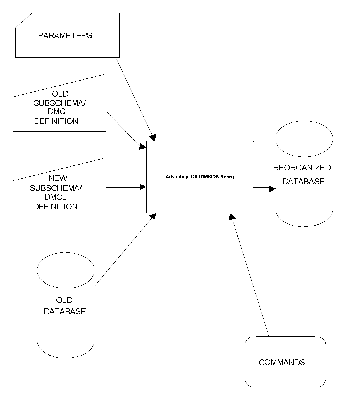 - Parameters --You supply input parameters to direct CA IDMS/DB Reorg, to indicate which subschemas and DMCLs are to be used for reorganization, and to indicate which areas are to be copied.