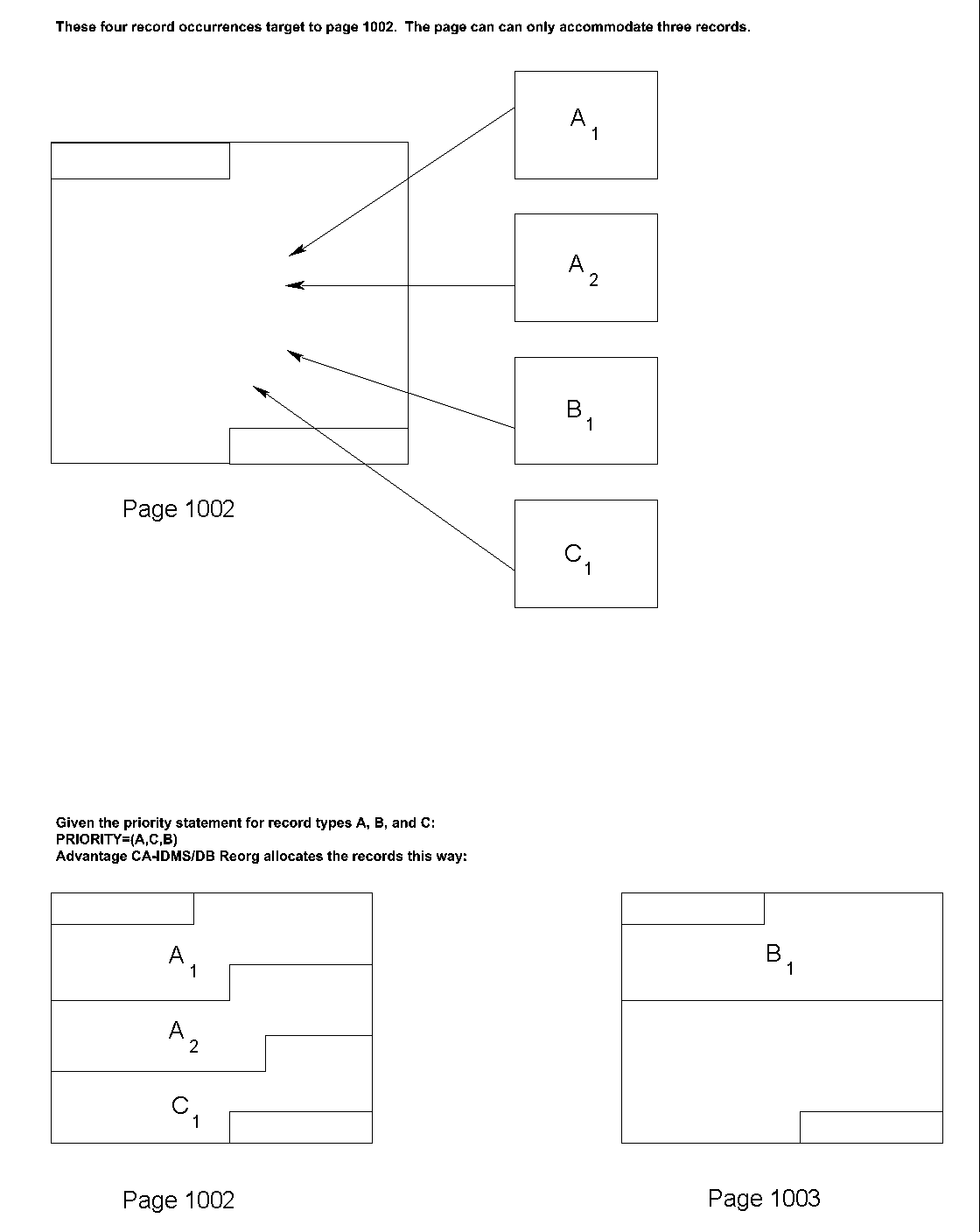 - Resolve record/page conflicts. The PRIORITY parameter allows you to specify which record types (or group of record types) are to be stored on the target page and which ones should overflow if the page is full. The priorities you assign take effect only when records overflow. The priorities you assigned to record types are used to determine which records receive priority storage locations and which ones should overflow if a page isn't large enough to store all records targeting to it.