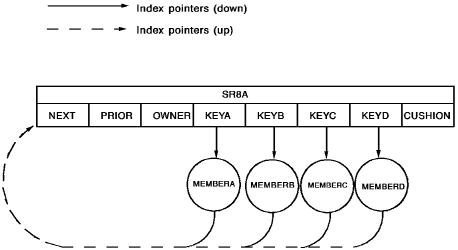 The SR8 record in the diagram contains four entries and a cushion. Each index entry contains an index pointer that points to a database occurrence that is a member of the indexed set; each member occurrence contains an index pointer that points to that SR8 record. (Note that, for simplicity, prior and owner pointers are not included in this figure.)