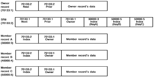 Thus, an index is a chained set between the indexed set's owner record and the SR8 records. An index contains SR8 records chained by next, prior, and owner pointers to the indexed set's owner record. For simplicity, prior and owner pointers are not included in the next figure):