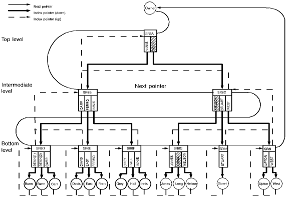 The bottom level is made up of one SR8 record for each entry in the intermediate level. Each entry is composed of a symbolic key and a pointer to a database record occurrence.