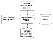 Figure 2.1 illustrates the conceptual flow of requests through the CA Endevor/DB Security System. Both the CA Endevor/DB Online System and the CA IDMS compilers gain authorization to update entities through CA Endevor/DB.