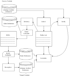 At this point in the process, all entities committed to promotion are updated in the target system via standard compilers running stand-alone or indirectly through a migrator. During migration, the Dynamic Change Monitor on the target system is run in a special migration mode to reflect that the data dictionary modifications are the result of migration. This is accomplished by passing a special command to the Change Monitor through program NDVRBOOK in a procedure described later in this section. Resultant migration Change Log Entries (Migrate-in CLEs) on the target system (CLE action code = V) are stamped with a "footprint" containing the exact date and time received, the source system identification, and the time the entity was selected on the source system. Figure 8.4 reflects this process. The Migrate-in CLEs can be created regardless of the migration procedure used at an installation.