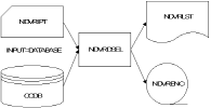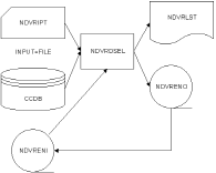DATABASE: The CCDB is used with any INCLUDE/EXCLUDE statements to produce the NDVRENO file. The NDVRENO file contains a user-editable entity list and control information. From this point forward, the NDVRENO data set is used as input to other promotion support programs. DATABASE is used for the initial run of NDVRDSEL when change history is used to select entities for migration. After externally editing the entity list in the NDVRENO file (if necessary), subsequent runs for integrity edits would be done with INPUT=FILE and an NDVRENI file.