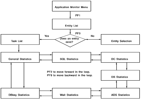 If, instead of choosing an entity and task, you press a PF key to go directly to a statistics screen, the Application Monitor provides statistics for the current task of the current entity.