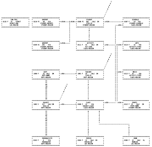 ────── CA IDMS Schema Mapper: mm/dd/yy hh:mm:ss SUBSCHEMA DBRR1016, SCHEMA DSRR1016, VERSION 1, DICTNAME=TKIT, DBNAME= RECORD CROSS-REFERENCE LISTING RECORD NAME LOCATION / PAGE ----------- ------------------ ACTIVITY 94, 27 / AA ARTS 150, 27 / BA CLASS 94, 74 / AB CON-TROL 1, 12 / AA DEPT 39, 48 / AA DREPORT 39, 12 / AA GREPORT 39, 27 / AA MUSIC 150, 48 / BA PERIOD 94, 95 / AB PREREQ 39, 95 / AB ROOM 150, 95 / BB SCHEDULE 150, 12 / BA SPORTS 150, 74 / BB STUDENT 94, 12 / AA SUBJECT 39, 74 / AB TEACHER 94, 48 / AA ────── CA IDMS Schema Mapper: mm/dd/yy hh:mm:ss SUBSCHEMA DBRR1016, SCHEMA DSRR1016, VERSION 1, DICTNAME=TKIT, DBNAME= SET/INDEX CROSS-REFERENCE LISTING SET NUMBER SET OR INDEX NAME OWNER LOCATION / PAGE MEMBER LOCATION / PAGE ------ ----------------- --------------------------------------- ------------------------------------ 1 ACTIVITY-TYPES ACTIVITY 94, 27 / AA ARTS 150, 27 / BA ACTIVITY-TYPES NP OA LAST MUSIC 150, 48 / BA ACTIVITY-TYPES NP OA LAST SPORTS 150, 74 / BB ACTIVITY-TYPES NPO OM LAST 2 CLASS-SCHEDULE CLASS 94, 74 / AB SCHEDULE 150, 12 / BA CLASS-SCHEDULE NPO MA ASC ROSTER-NO DL 3 DEPT-ACADEMIC DEPT 39, 48, / AA SUBJECT 39, 74 / AB DEPT-ACADEMIC NO MM NEXT 4 DEPT-GENERAL DEPT 39, 48 / AA SUBJECT 39, 74 / AB DEPT-GENERAL NO MM NEXT 5 DEPT-TEACHER DEPT 39, 48 / AA TEACHER 94, 48 / AA DEPT-TEACHER NPO OM LAST 6 IX-DEPT-NAME SYSTEM (SR7) DEPT 39, 48 / AA IX-DEPT-NAME N MA MODE = INDEX ASC DEPT-NAME DF