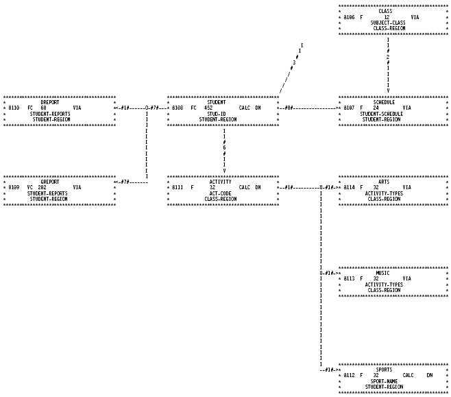 Example 2 shows how the user changed the print characters used to draw the data structure diagram. This example also illustrates the INCLUDE statement by representing only the areas that the user specified instead of representing the entire schema or subschema. (See Exhibit 5.Exhibit 4.e print characters were changed--The user knew that the default characters used to draw the left and right arrows in the diagram, the less-than ( < ) and greater-than ( > ) symbols, were not on the user's print chain. In addition, the user wanted to experiment with the characters used to draw record blocks, set connections, and indexes.
