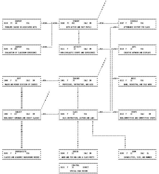 CA IDMS Schema Mapper: mm/dd/yy hh:mm:ss SUBSCHEMA DBRR1016, SCHEMA DSRR1016, VERSION 1, DICTNAME=TKIT, DBNAME= RECORD CROSS-REFERENCE LISTING RECORD NAME LOCATION / PAGE ----------- ------------------ ACTIVITY 70, 27 / AA ARTS 114, 27 / BA CLASS 70, 74 / AB CON-TROL 1, 12 / AA DEPT 27, 48 / AA DREPORT 27, 12 / AA GREPORT 27, 27 / AA MUSIC 114, 48 / BA PERIOD 70, 95 / AB PREREQ 27, 95 / AB ROOM 114, 95 / BB SCHEDULE 114, 12 / BA SPORTS 114, 74 / BB STUDENT 70, 12 / AA SUBJECT 27, 74 / AB TEACHER 70, 48 / AA ────── CA IDMS Schema Mapper: mm/dd/yy hh:mm:ss SUBSCHEMA DBRR1016, SCHEMA DSRR1016, VERSION 1, DICTNAME=TKIT, DBNAME= SET/INDEX CROSS-REFERENCE LISTING SET NUMBER SET OR INDEX NAME OWNER LOCATION / PAGE MEMBER LOCATION / PAGE ------ ----------------- --------------------------------------- ------------------------------------ 1 ACTIVITY-TYPES ACTIVITY 70, 27 / AA ARTS 114, 27 / BA ACTIVITY-TYPES NPO OA MUSIC 114, 48 / BA ACTIVITY-TYPES NPO OA SPORTS 114, 74 / BB ACTIVITY-TYPES NPO OM 2 CLASS-SCHEDULE CLASS 70, 74 / AB SCHEDULE 114, 12 / BA CLASS-SCHEDULE NPO MA 3 DEPT-ACADEMIC DEPT 27, 48, / AA SUBJECT 27, 74 / AB DEPT-ACADEMIC NO MM 4 DEPT-GENERAL DEPT 27, 48 / AA SUBJECT 27, 74 / AB DEPT-GENERAL NO MM 5 DEPT-TEACHER DEPT 27, 48 / AA TEACHER 70, 48 / AA DEPT-TEACHER NPO OM 6 IX-DEPT-NAME SYSTEM (SR7) DEPT 27, 48 / AA IX-DEPT-NAME N MA 7 IX-STUD-LNAME SYSTEM (SR7) STUDENT 70, 12 / AA IX-STUD-LNAME N MA