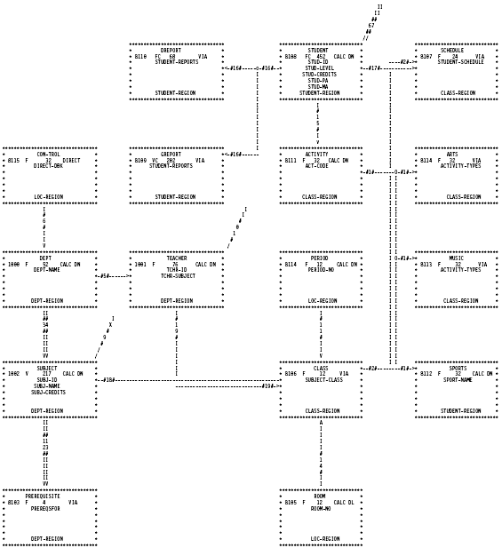 Output Produced--Exhibits 4.14 and 4.15 show the data structure Diagram and the Cross-Reference Report. Note that every record block has enough space to accommodate the record type with the most CALC keys. Also note that every set description has enough space to accommodate the set with the most sort keys.