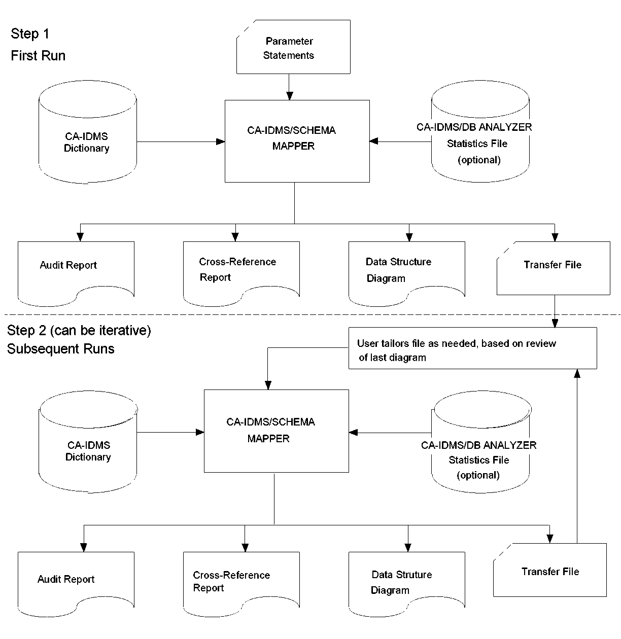 Step 2--Execute CA IDMS Schema Mapper again, making modifications to the input, if needed, by using the optional parameters. You can use the Transfer File as input whenever you execute the second step.
