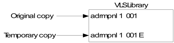 The original copy, which contains the changes you made during the editing session, is overwritten by the rollback (E) copy, as shown below. Any changes made since the beginning of the editing session are lost when the panel definition is refreshed from the rollback copy as shown in the following illustration.
