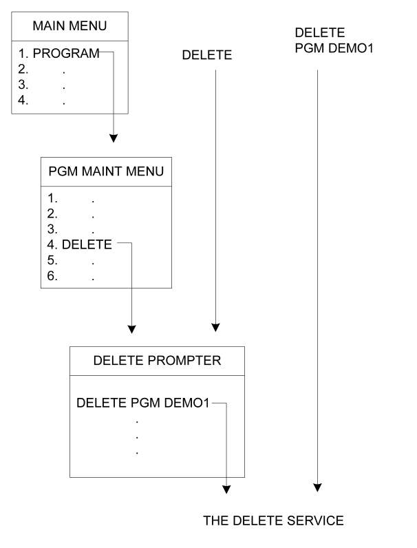 The following graphic shows an example of the relationship between commands and menu‑driven services. Using the menu‑driven approach, the Main Menu and its associated menus and prompters provide the delete service. Following the route illustrated in the diagram, the Main Menu selection of option 1 takes you to the Program Maintenance Menu. Then option 4 of the Program Maintenance Menu takes you to the delete prompter, which, once completed and entered, provides the delete service.