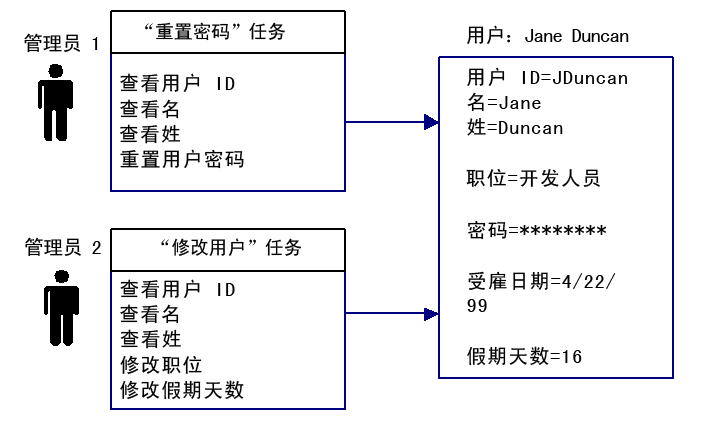 为规划管理任务的创建,需决定需要管理的对象(用户、组、组织、角色或任务)以及将要使用这些任务的管理员。 例如: