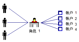 下图显示了四个帐户,这些帐户组合成一个配给角色并分配给了三名用户: 将配给角色分配给用户时,每个用户均将获得四个帐户