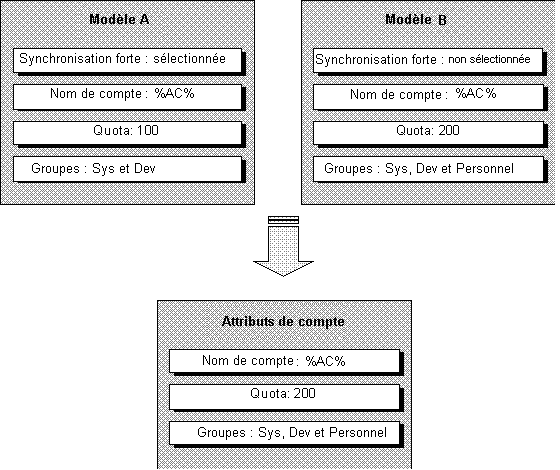 L'exemple suivant décrit la combinaison de plusieurs modèles de compte en un modèle de compte unique applicable. Dans cet exemple, un modèle de compte est marqué pour la synchronisation faible et l'autre pour la synchronisation forte. Par conséquent, le modèle de compte applicable combinant les deux modèles de compte est considéré comme un modèle de compte de synchronisation forte. L'attribut Quota de nombre entier accepte la valeur la plus grande des deux modèles de compte et l'attribut Groupes à valeurs multiples accepte l'union des valeurs des deux stratégies.