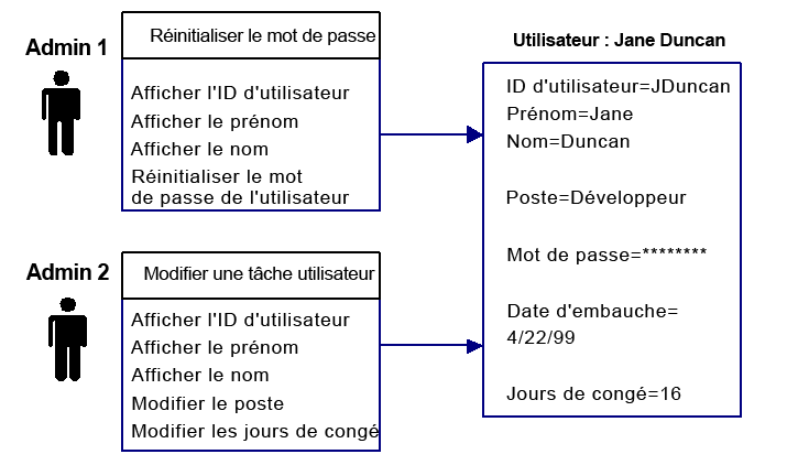 Pour un type d'objet (par exemple, Utilisateurs), vous pouvez créer des tâches de sorte que différents administrateurs gèrent différents attributs. Par exemple, le schéma suivant présente un utilisateur géré par deux administrateurs.