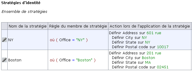 Vous pouvez utiliser un ensemble de stratégies d'identité pour affecter automatiquement des valeurs d'attributs d'utilisateurs en fonction d'une autre valeur d'attribut ou d'un autre droit d'utilisateur. Par exemple, vous pouvez créer un ensemble de stratégies d'identité qui indique automatiquement l'adresse postale d'un utilisateur en fonction de son bureau à domicile.