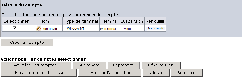 Pour chaque compte, Identity Manager affiche les informations telles que le nom du compte, le terminal du compte et le statut du compte. Pour une tâche Modifier, les options supplémentaires sont disponibles pour changer le mot de passe d'un utilisateur et verrouiller ou suspendre un compte.