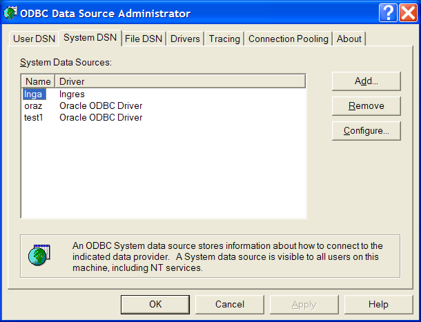 On the Endpoint Tab of the Ingres Endpoint Property Sheet you can specify the authentication attributes such as the Data Source Name (DSN). This name should coincide with one of the names in the ODBC Data Source Administrator on the System DSN page on the machine where Provisioning Server is installed. This DSN should be properly configured to point to the desirable target system.
