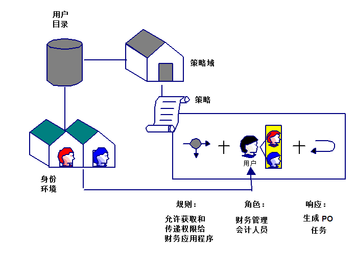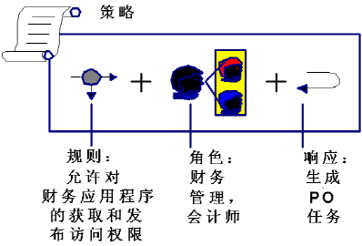 在策略域中创建 SiteMinder 策略,这在逻辑上将用户目录和受保护的资源联系在一起。 下图说明基于角色的策略中的策略对象的关系。