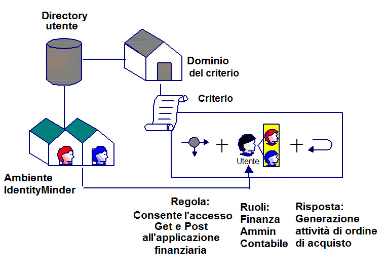 È possibile associare i criteri di SiteMinder a utenti, a ruoli o a utenti e ruoli. Quando un utente o un membro del ruolo tenta di accedere a una risorsa protetta, SiteMinder utilizza le informazioni nel criterio per decidere se concedere l'accesso e attivare le risposte.