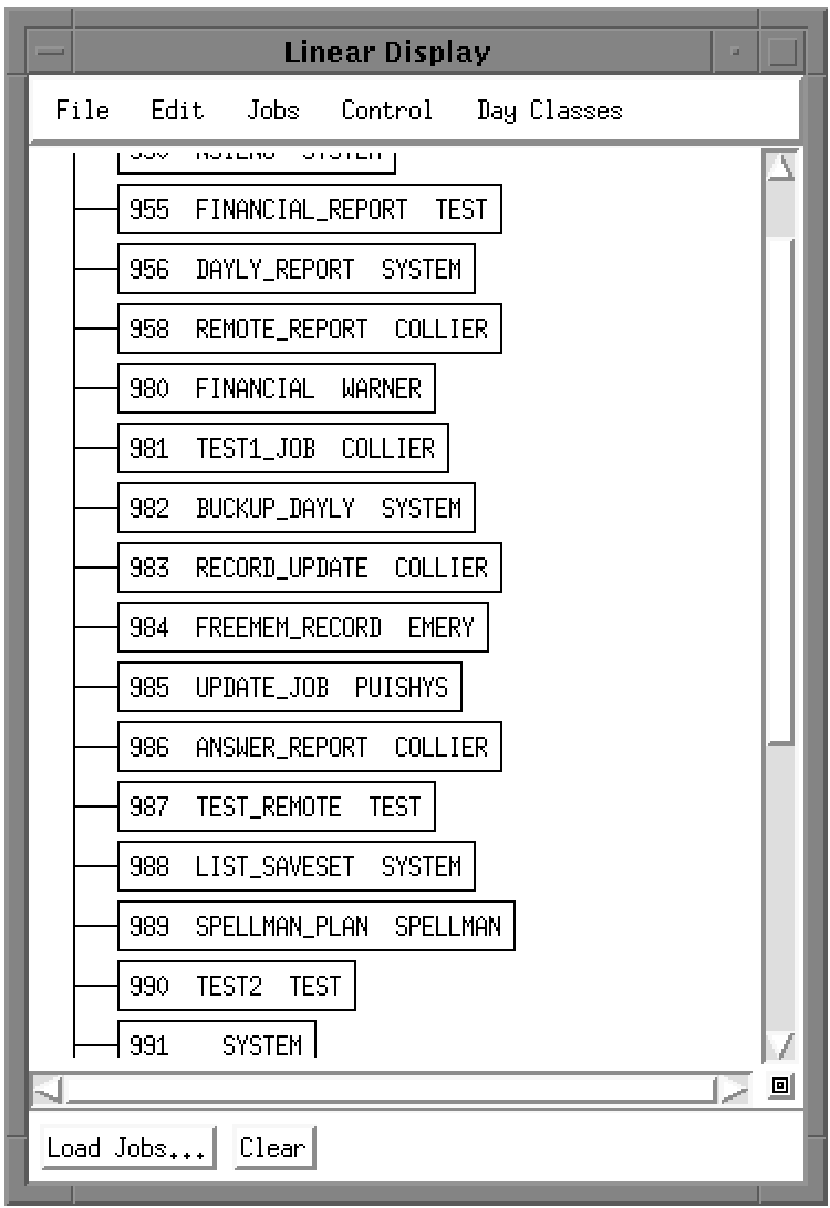 The Linear Display window displays a list of the jobs you selected from the Load Jobs dialog. Each rectangle in the Linear Display window shows the number, name, and owner of a selected job.