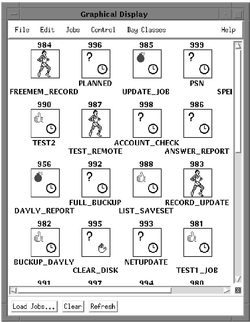 The Graphical Display window provides a graphical display of jobs in the Job Management Manager database. Each box shown in this window represents a job. Each job is labeled with its job number preceding and followed by its job name. Refer to Interpreting Your Job Display for more information about interpreting your job display.