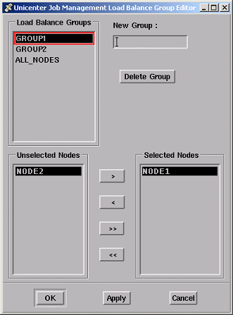 From the editor, you can select the nodes from your local cluster that you want to include as members of the Load Balance group. The dialog box includes a list of Load Balance Groups. For the currently selected Load Balance group, the editor displays a list of Unselected Nodes and a list of Selected Nodes. With the editor, you can also delete a group and specify a new group name.