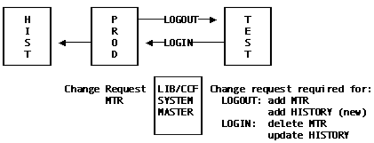 When a member is logged out for the first time, a History member is created. This member contains an abstract of the member, language, description, and the name of the system where it belongs. Each time a login function is performed for that member, this history member is updated to reflect the changes, the number of the change request requesting the changes, and the programmer responsible. Therefore, another required LIB/CCF file is the history master file.