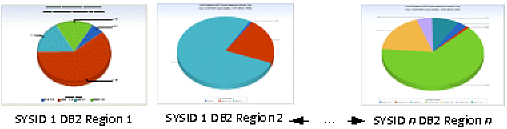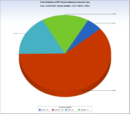 The DB2TCT query generates a daily pie chart for each DB2 region showing the percentage of DB2 threads initiated by each connection type.