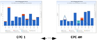 The example shows the CPC level chart generated for jobs executing on an IBM z/196 2817-615 CPC. The largest user of CPU time was the job ‘URUJOBXR’. The chart shows that for the day depicted, the job only had one step completion spanning five interval records, and consumed just over 1.2 hours of CPU time. Most of this time was Step TCB Time. Job ‘SALSAL54’ consumed significant SRB and I/O Interrupt CPU time, indicating significant I/O activity.