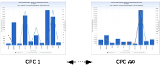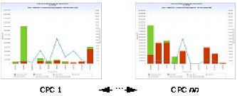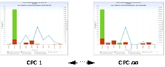 For CPU, the CPU time used by each of the top ten programs is displayed using a vertical bar. The bar is segmented by CPU time type (for example, TCB, SRB, I/O Interrupt, zIIP, zAAP, and so on). Two horizontal lines show the program count (number of unique program executions) and interval count (number of interval records) encountered for the program. For short running steps, the interval count and program count values have similar values. For long running programs, the interval count exceeds the program count.