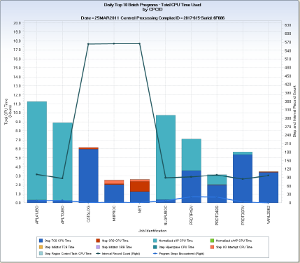 The example shows the CPC level chart generated for started tasks executing on an IBM z/196 2817-615 CPC. The largest user of CPU time was the started task ‘APLA1JBO’. The chart shows that for the day depicted, the started task only had 8 step completions spanning 101 interval records, and consumed just over 11 hours of CPU time. Most of this time was Normalized zIIP CPU time. The normalization of zIIP CPU time is important for this CPC model because the CP engines run slower than the specialty (zIIP/zAAP) engines. When zIIP or zAAP CPU time is normalized, the value is expressed as the CP engine equivalent by multiplying by a normalization factor. For the 2817-615 CPC model, the normalization factor is 1.52734.
