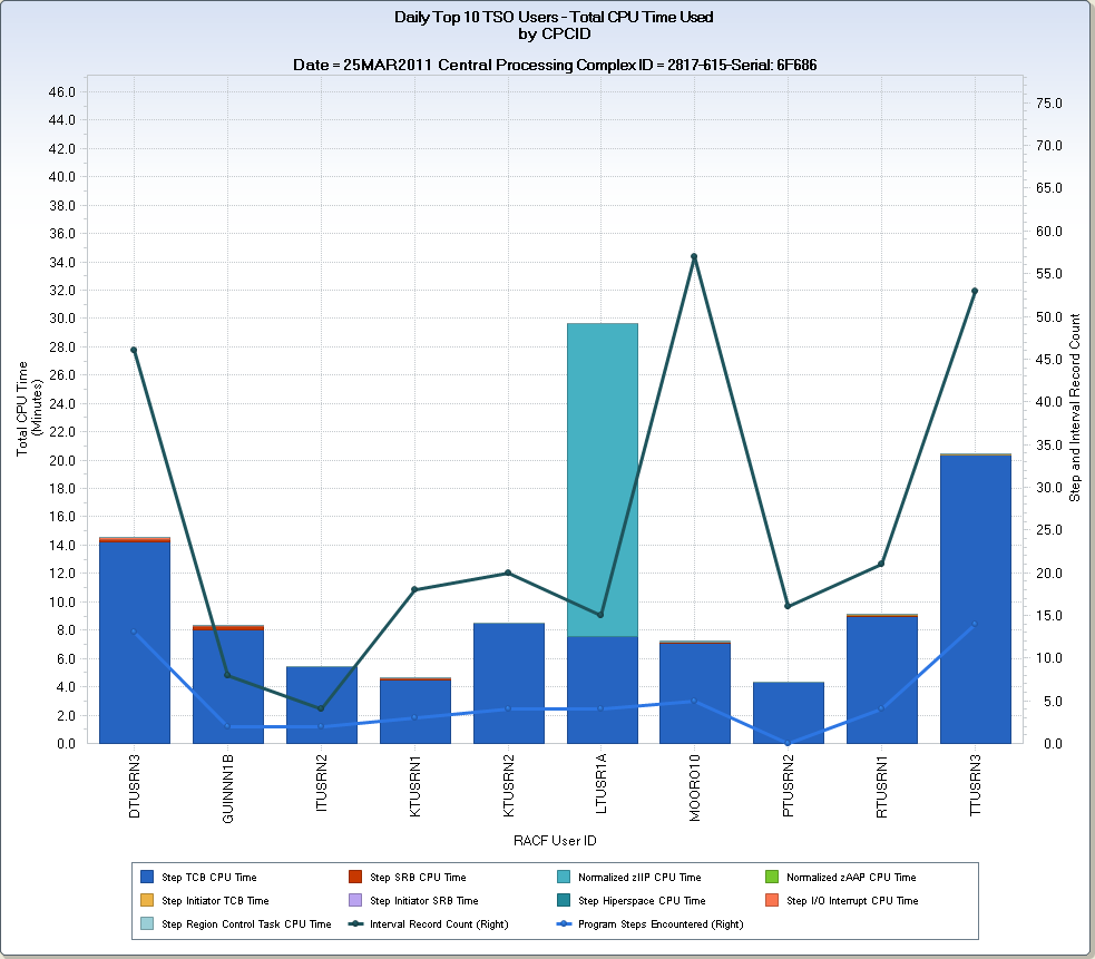 The SMFTUT query generates several chart sets. The chart sets show the daily top nn (default 10) TSO users based on use of CPU, I/O, and central storage (memory) resources on your z/OS systems. For each resource type, one chart set shows the top ten TSO users using the resource over the entire Central Processing Complex (CPC), and another that shows the top ten TSO users for each z/OS system. The query reads detail data from the BAT_TS (SMF User TSO Activity) file, and summarizes the data by User Identification. The charted data reflects summarized interval and step record information from all TSO sessions for the top ten TSO users.
