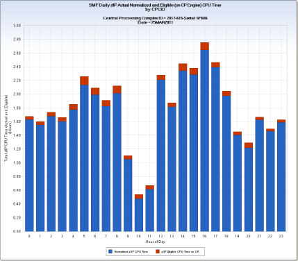 The first chart shows the total hourly zIIP engine CPU time demand with actual zIIP engine use (blue) and eligible (red) using stacked vertical bars. The peak zIIP engine demand occurred during hour 16. At that hour, 2.65 hours of normalized zIIP engine CPU time were used, and 0.11 hours of CP engine time was used to execute zIIP eligible work. The normalization of zIIP CPU time is important for this CPC model because the CP engines run slower than the specialty (zIIP/zIIP) engines. When zIIP or zIIP CPU time is normalized, the value is expressed as the CP engine equivalent by multiplying by a normalization factor. For the 2817-615 CPC model, the normalization factor is 1.52734.