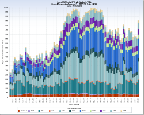 CA MICS Hardware and SCP Analyzer (RMF) Queries › Mainframe MSU Utilization and LPAR Capping › RMFMSU – Daily CPC MSU Use with Stacked LPARs