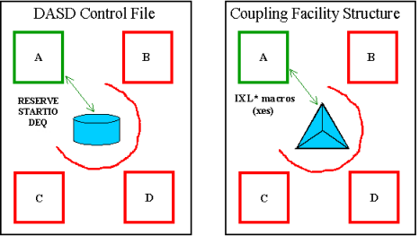 Physical control files reside on hardware devices that are accessible by all systems in the enterprise. Examples of physical control files would be 1) a control file residing on shared DASD hardware and 2) a list structure residing in a coupling facility. With DASD control files, serializing access is achieved using RESERVE/DEQ macros and I/O operations are performed using the STARTIO macro. With coupling facility control files, serialization is achieved and I/O operations are performed using Cross System Extended Services (XES) IXL* macros. For this reason, the CA MIM coupling facility control files are commonly referred to as XES control files.