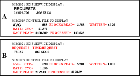 The preceding data can be analyzed as follows: SYSA appears to be a workload-intense production system, while SYSB seems to be a test system as it has very little enqueue activity. CA MIM is performing control file cycles at a rate of roughly 22 times per second on SYSA, and only one time per second on SYSB. Remember that when in DEMAND mode, control file cycles are driven primarily by 1) CA MII enqueue workload or 2) a timer expiration. Because the number of enqueue requests on SYSA is high, it is a good assumption that CA MIM control file cycles are being driven by the enqueue workload. In addition, because the number of enqueue requests on SYSB is low, it is fair to say CA MIM control file cycles are being driven only by the timer expiration.