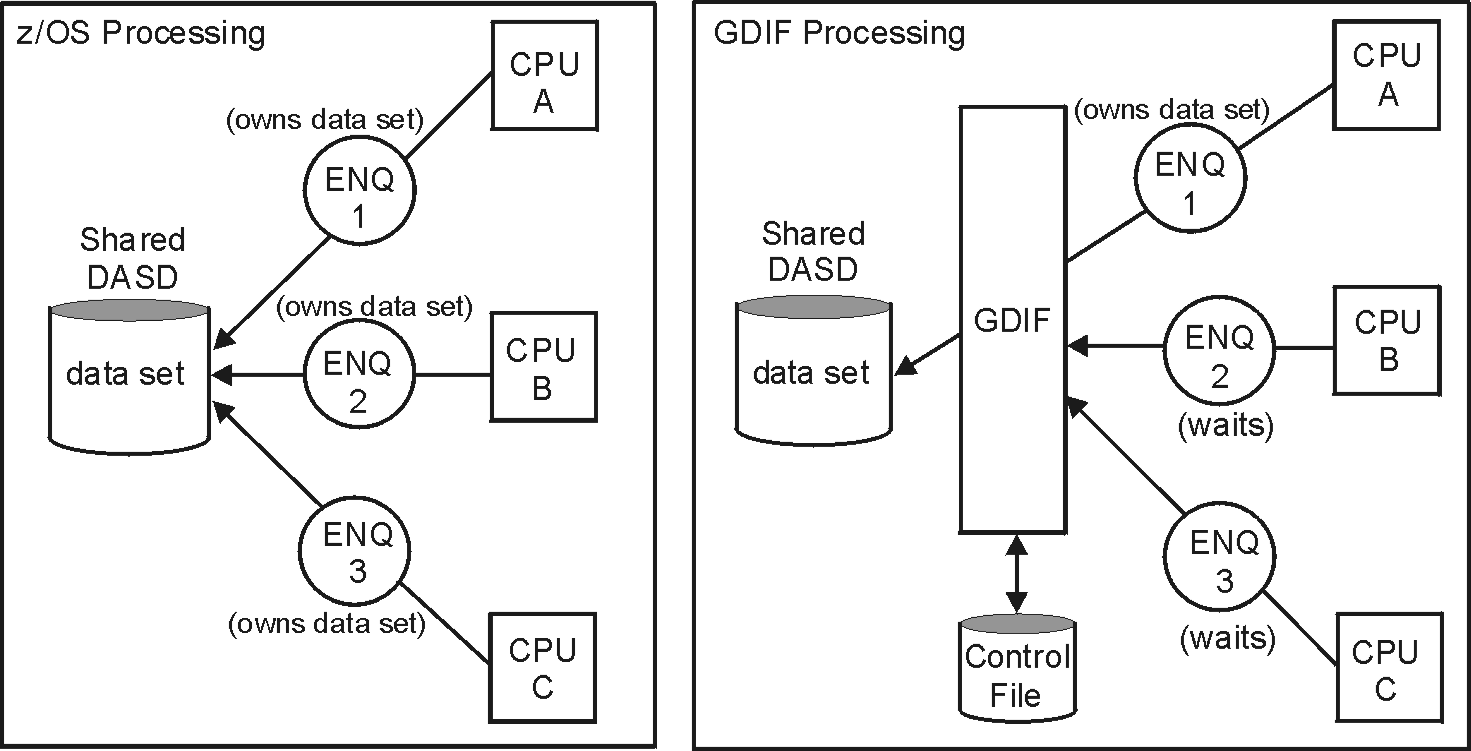 By propagating ENQ requests to all systems, GDIF provides cross-system integrity for resources not typically protected by hardware reserves. This allows more sharing of resources between systems. By converting hardware reserves to enqueues and propagating them to all systems, GDIF improves system performance. The following figure illustrates how GDIF ENQ processing enhances z/OS ENQ processing and shows how GDIF improves integrity while ensuring serialization: