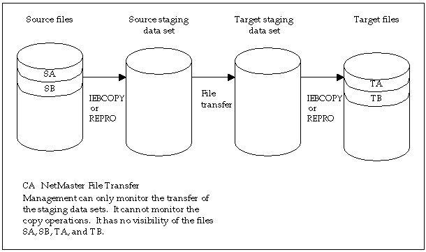 When staging mode operation is used, CA NetMaster FTM can only monitor the transfer of the staging data sets. It has no visibility of the files that were copied into that data set. For this type of file transfer, ensure that your file name criterion specifies the staging data sets and not the copied files.