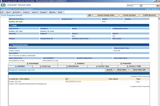 address SERVDESK "REQUEST(CREATE) SUMMARY('Test 2')