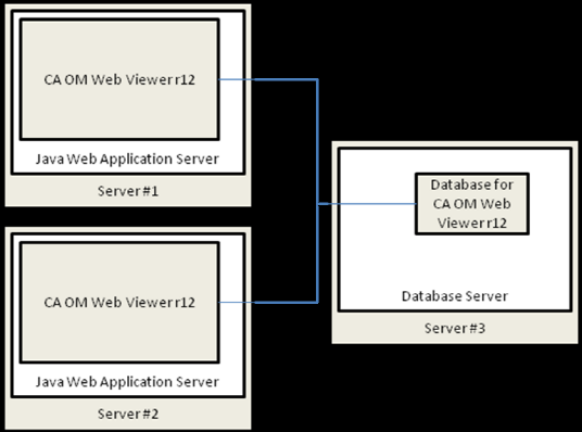 For better scalability, multiple instances of CA OM Web Viewer can be deployed on several Java Web application servers and set to connect to a centralized database server.