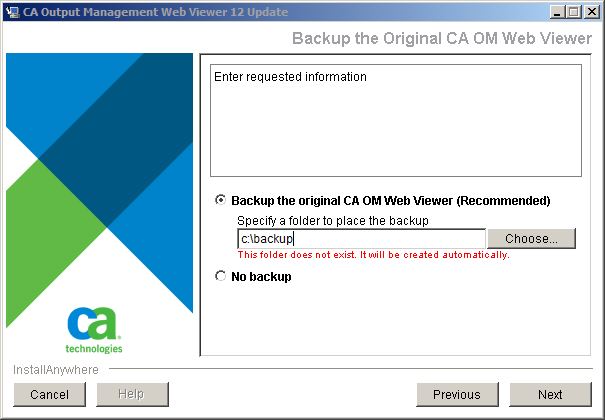 The update installer backs up your original CA OM Web Viewer as a pair of WAR files (CAOMWebViewer12.war and the supplementary WAR file castylesr5.1.3.war). These files are placed into a folder specified in this panel.