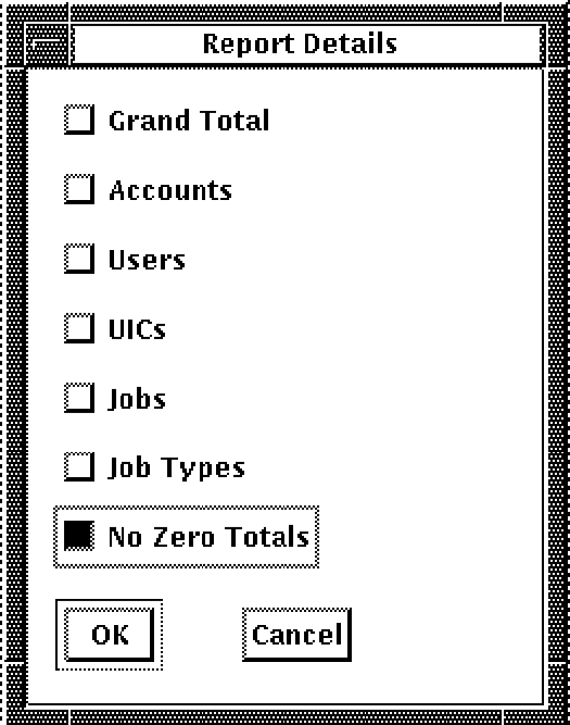 To select report details, release on the Report Details.... menu item. The dialog box shown in this section is displayed. Click on the toggle buttons to select the report details that you want. When you have completed your selections, click on OK.