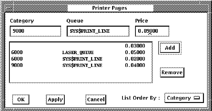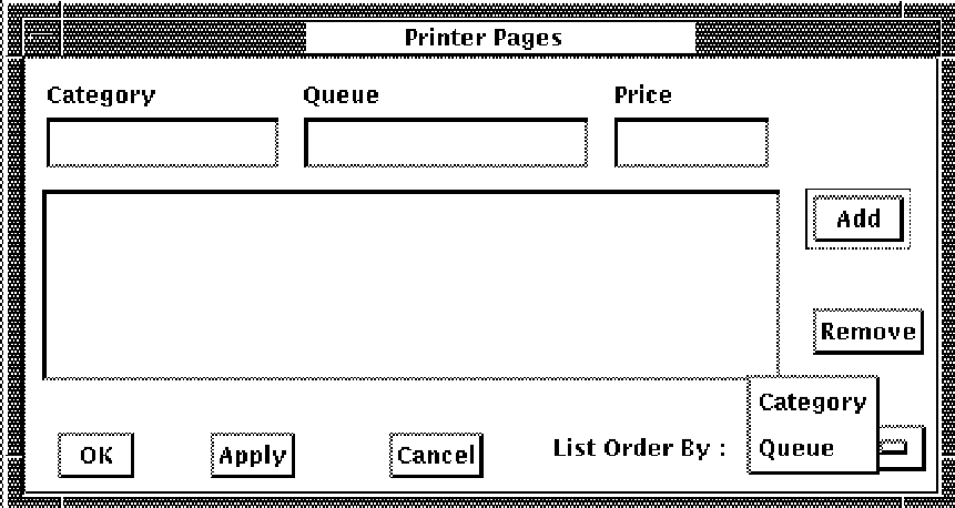 To enter prices, pull down the Select menu and release on the Printer Pages . . . menu item. You can display the entries by category or by queue. Point to the List Order By: box and press and release on the choice you want. The selections are shown in the following figure.