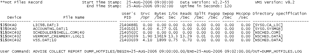The following example shows a sample hot files record dump report. Hot file records are not available in history data. The following table describes the headings in the hot files record section of the dump report.