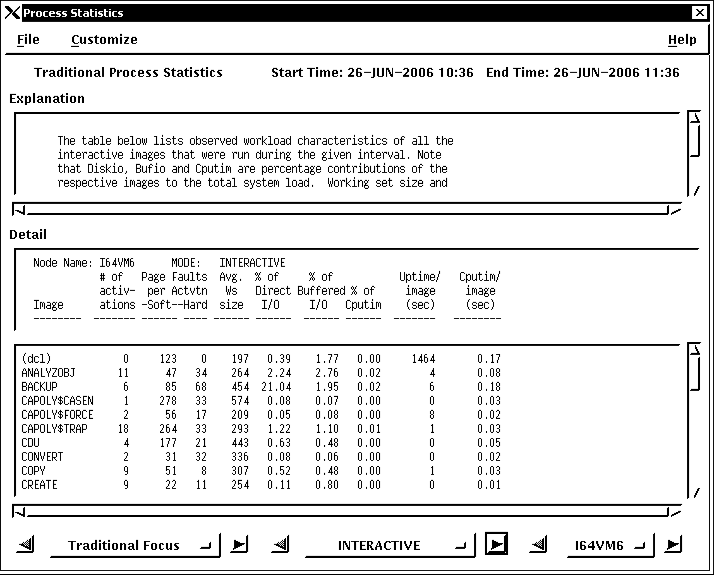 To navigate through the Process Statistics Reports, click the Traditional Focus label. An option menu appears listing all of the Process Statistics Reports. Release on the report type you want displayed. You can also advance through the reports by clicking on the appropriate direction arrows.